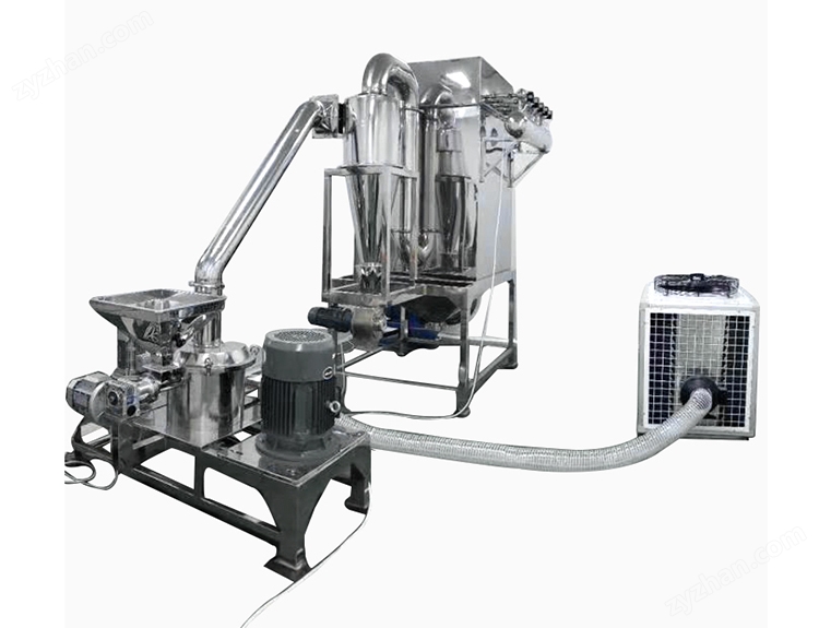 江陰盛田機(jī)械工程部研發(fā)人員針對(duì)原料的特殊性,多次試料并在兩個(gè)月內(nèi)研發(fā)出D級(jí)凈化低溫超微粉碎機(jī)。該設(shè)備由工業(yè)冷風(fēng)機(jī)、進(jìn)料倉(cāng)、粉碎機(jī)、分級(jí)機(jī)、旋風(fēng)下料裝置、排風(fēng)過(guò)濾裝置、引風(fēng)機(jī)、D級(jí)凈化系統(tǒng)及電控柜組成。普通超微粉碎機(jī)在運(yùn)轉(zhuǎn)過(guò)程會(huì)產(chǎn)生相當(dāng)高的熱量,為了降低機(jī)腔及管道內(nèi)的溫度,采用了大功率冷風(fēng)機(jī),物料在設(shè)備內(nèi)部粉碎時(shí)溫度控制范圍:10~25℃。進(jìn)風(fēng)口采用D級(jí)凈化,整個(gè)生產(chǎn)過(guò)程在D級(jí)潔凈空氣下進(jìn)行。原料易粘附,工程部技術(shù)人員對(duì)粉碎機(jī)腔進(jìn)行了改造,使設(shè)備內(nèi)部無(wú)原料殘留物。加裝西門(mén)子變頻器控制轉(zhuǎn)速可改變出料細(xì)度,粉碎細(xì)度控制在100目。設(shè)備采用西門(mén)子PLC加觸摸屏自動(dòng)化控制,控制系統(tǒng)器件采用西門(mén)子品牌(包含觸摸屏、PLC及擴(kuò)展模塊、變頻器),其余配電器件采用施耐德品牌。