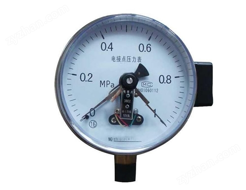 電接點壓力表由測量系統、指示系統、磁助電接點裝置、外殼、調整裝置和接線盒(插頭座)等組成。一般電接點壓力表是用于測量對銅和銅合金不起腐蝕作用的氣體、液體介質的正負壓力,不銹鋼電接點壓力表用于測量對不銹鋼不起腐蝕作用的氣體、液體介質的正負壓力并在壓力達到預定值時發出信號,接通控制電路,達到自動控制的報警的目的。