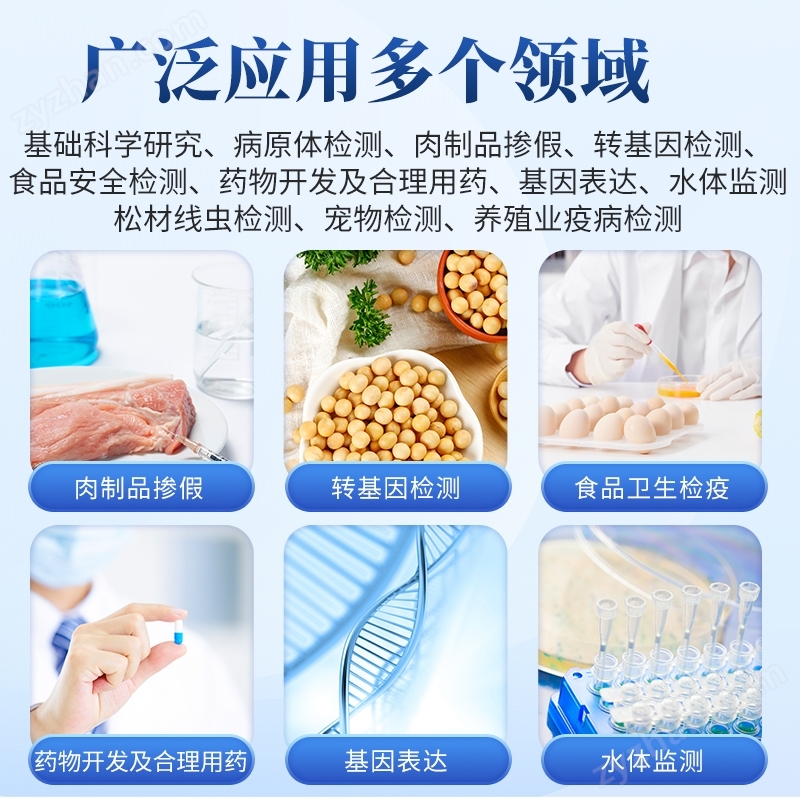 基礎科學研究、病原體檢測、肉制品摻假、轉基因檢測、食品安全檢測、藥物開發及合理用藥、基因表達、水體監測、松材線蟲檢測、寵物檢測、養殖業疫病檢測