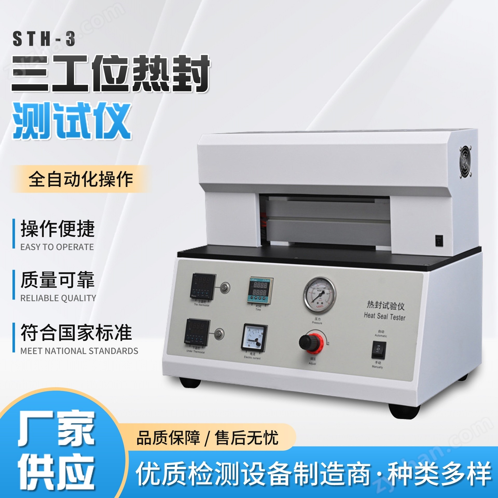 采用熱壓封口法,將待封試樣置于上下熱封頭之間,在預先設定的溫度、壓力、和時間下,完成對試樣的封口,適用于測定塑料薄膜基材、軟包裝復合膜、涂布紙及其它熱封復合膜的熱封溫度、熱封時間、熱封壓力等參數,為用戶提供準確的熱封試驗指標。控制系統全數字化,關鍵部件采用產品,自動化程度高,操作簡便。