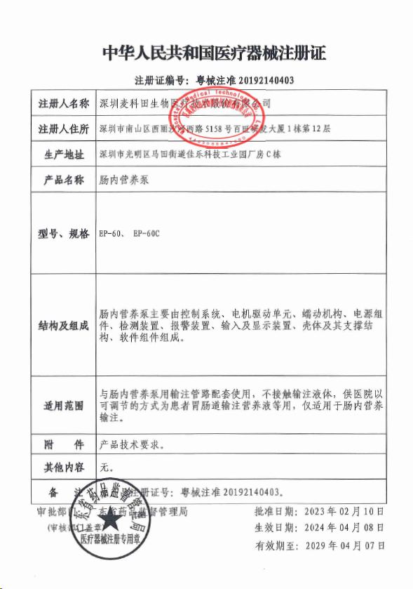 適用范圍/預期用途 與腸內營養泵用輸注管路配套使用,不接觸輸注液體,供醫院以可調節的方式為患者胃腸道輸注營養液等用,僅適用于腸內營養輸注。