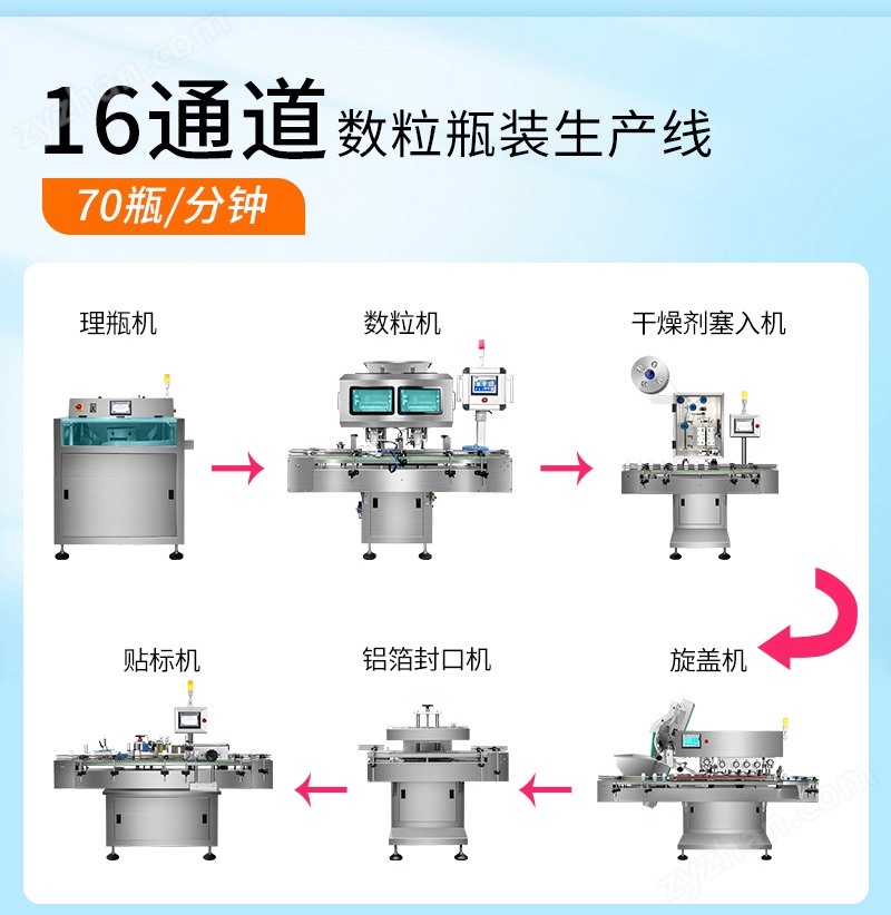 16通道數粒瓶裝生產線是一套高效能的自動化計數包裝系統,專為處理片劑、膠囊、丸劑、糖果等固體制劑而設計。該數粒瓶裝線由理瓶機、16通道高速電子數粒機、干燥劑塞入機、旋蓋機、鋁箔封口機與不干膠貼標機等單元組成,實現從空瓶到成品貼標的全流程自動化作業。