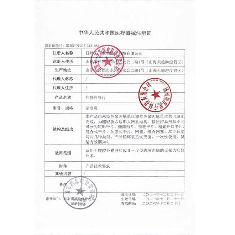 本產(chǎn)品由未染色聚丙烯單絲和藍(lán)色聚丙烯單絲共同編織而成,為超輕質(zhì)六邊形大網(wǎng)孔結(jié)構(gòu)。按照產(chǎn)品形狀不同可分為矩形平片、橢圓形片、預(yù)裁平片、精索開(kāi)口平片、復(fù)合式平片、加強(qiáng)式平片、網(wǎng)塞、組合網(wǎng)塞、3D立體型網(wǎng)片幾種類(lèi)型。產(chǎn)品經(jīng)環(huán)氧乙烷滅菌,一次性使用。貨架有效期3年。