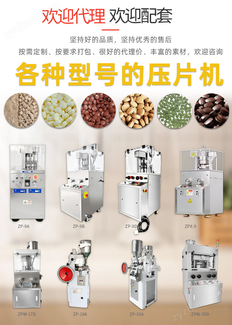 本機是一種自動旋轉、連續壓片的機器。它主要用于制藥、食品、化工、電池、電子、陶瓷等工業部門,將顆粒狀原料壓制成片劑,適用于能壓制成形的、含粉量(100目以上)不超過10%的顆粒狀原料的壓制。不適用于半固體,潮濕低熔點、易潮原料和無顆粒的粉末壓制,本機適用于壓制圓形、異形、雙面刻字片劑,帶plc控制,觸摸屏操作,帶預壓,帶壓力顯示,帶剃廢功能。