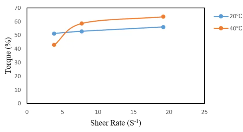 在確定潤滑脂表觀粘度的測試方法時,應通過調節(jié)轉子及轉速(或剪切率),使流變儀的扭矩讀數(shù)在10% - 90% 之間(中高扭矩為佳),以獲得穩(wěn)定且準確的粘度測試結果。根據(jù)圖3中扭矩隨剪切率變化的情況,該潤滑脂在20、40 ℃條件下進行剪切率掃描測試時,在4、8、20 1/S三種剪切率下,扭矩讀數(shù)在40-60%之間,因此,這三種剪切率均可以作為該潤滑脂的粘度測試條件。此外,為了獲得具有重現(xiàn)性的測試結果,必須確保測試條件的一致性(流變儀機型、轉子編號、轉速或剪切率、溫度、測試時間、樣品量等)。